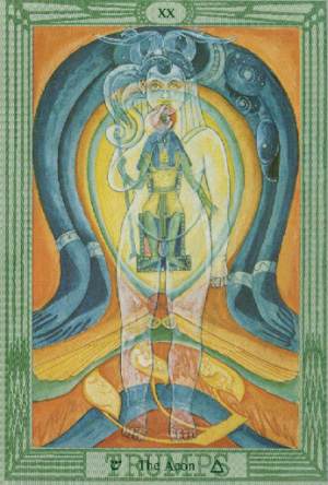 Aeon XX. Základní význam: Transformace jednoho ve druhé, ztráty jsou oželeny s tím, že přijdou nové a ještě lepší časy. Ukončení vleklých záležitostí. Jasná představa o budoucím životě. Nastolení nového pořádku, dobrovolně či nedobrovolně. Krátce: Rozhodování. Další významy: Náhlé změny, a zvraty, vnější i vnitřní, vždy ale s dalekosáhlými následky na život dotčené osoby. Uzavření jednoho problému, aby byl čas na druhý. Potřeba jednat. Činorodost a chuť něco měnit. Důrazné jednání, které ovlivňuje druhé. Nevratné změny. Tazatel může být tím, kdo změny vymýšlí či vykonává i tím, kdo se jim podřizuje. Náhlý, nepromyšlený, někdy i zbrklý čin, který bude mít výrazné a nevratné důsledky. Zásadní změna v životě. Výrazné vlivy okolí, náhlé změny a zvraty, revoluce. Aktivita, často neuspořádaná. K zamyšlení nebo meditaci: Každý čin je posvátný. |