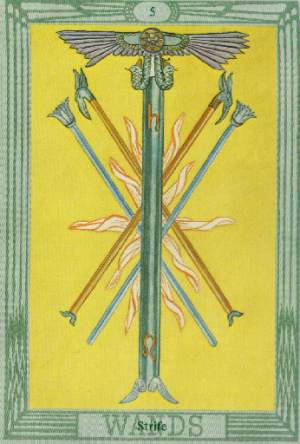 Boj Pětka Holí Základní význam: Nabídka. Možnost postoupit o kus dál za cenu zvýšené námahy a vypjaté pozornosti. Předzvěst úspěchu. Sportovní jednání. V práci a hmotných cílech: Výzva na souboj s neobvyklým úkolem. Ve financích doporučení k ostražitosti - může se objevit chytrý protivník. V úředních záležitostech doporučuje karta k podání stížnosti, odporu, odvolání či změnu právního postupu. V problémových jednáních znamená překonání překážky. Ve vztazích: Inspirativní intenzivní krátkodobý vztah. Spory v rodině, mající konstruktivní či očistný charakter. Se znepřátelenými osobami hádky končící vaším vítězstvím. Ve vnitřním světě a v osobním vývoji: Velmi dobrá karta pro dosahování duchovních a vývojových cílů. |
